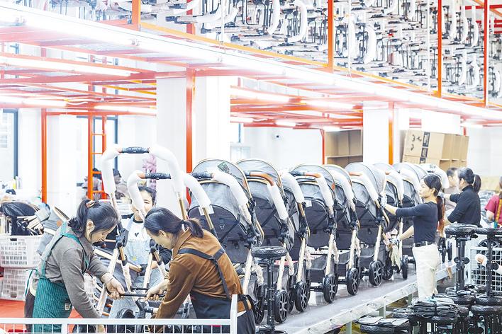 11月5日,汉川城隍镇后谷阳光童车生产线一片忙碌。今年,公司生产高景观婴儿车、轻型婴儿车(套)等15万辆,销往世界各地。今年上半年,汉川婴儿车出口额达3274万美元,同比增长30%以上。 (湖北日报全媒体记者倪娜 通讯员尹青 摄)